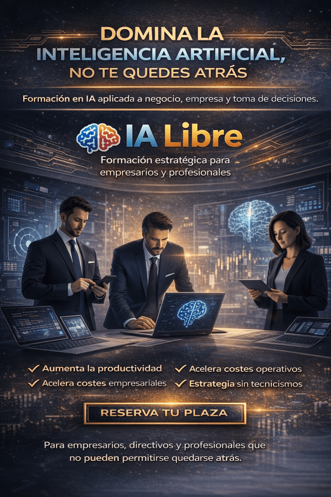 En IA Libre formamos a empresarios y profesionales para aplicar la Inteligencia Artificial con visión estratégica y resultados reales, sin tecnicismos innecesarios ni modas pasajeras.