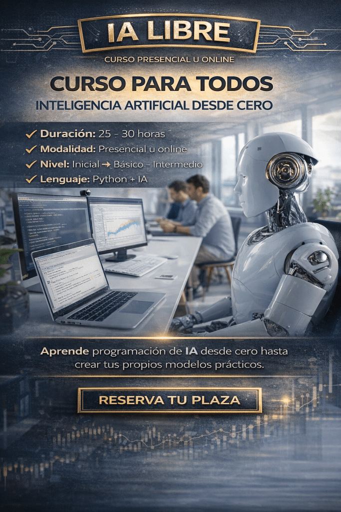 En IA Libre colaboramos con academias y centros de formación para impartir cursos de Inteligencia Artificial desde cero, adaptados a distintos perfiles y niveles, sin necesidad de conocimientos técnicos previos.